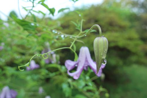 「クレマチス」の蕾にしがみつく露です。今にも零れ落ちそうです。