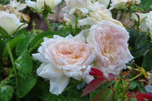 この品種は花びらに雨粒のクリスタルをまとい、薄暗い風景の中で一際輝きを見せます。