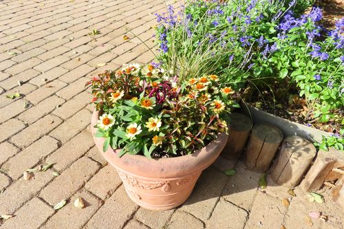 (下から)青のトレニアと白いジニア、紫のアンゲロニアが花壇を埋め尽くしています(^^)/