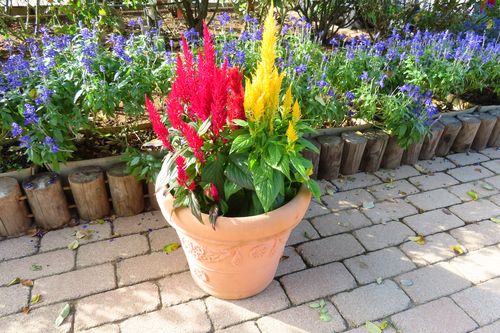 The・秋!って感じの鮮やかなケイトウやトウガラシ、マリーゴールドなど、様々な寄せ植えを展示しています。