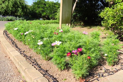 二週間前に植えこみました。このコスモスは矮化剤がかかっているため、草丈が高くなりにくいです。
