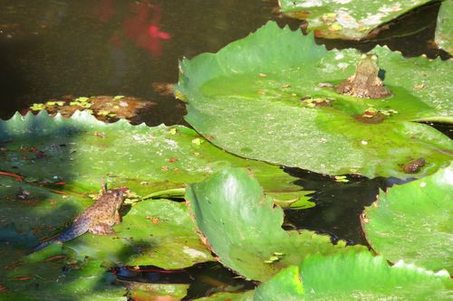 「熱帯性スイレン」の葉に乗った露です。粒の数が多いので賑やかな印象を受けます。
