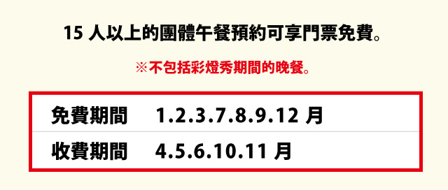 預訂團體遊客餐飲時,請最遲在5天前預訂。臨近用餐日預訂時,請聯繫我們,詢問是否可預訂。
