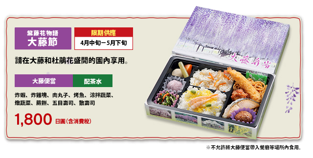 不承接4月中旬-5月中旬的「紫藤花物語」期間和夜間營業的晚餐預訂。詳情請聯繫我們。