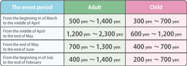 ※ During the events period “The tale of Fuji no hana ( wisteria flowers ) ”and“ The garden of flowers of illuminations ”,opening hours may change.