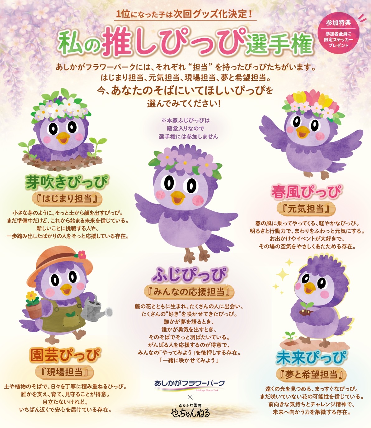 ゆるふわきゃらっぴの当園とのコラボキャラ「ふじぴっぴ」による私の推しぴっぴ選手権など