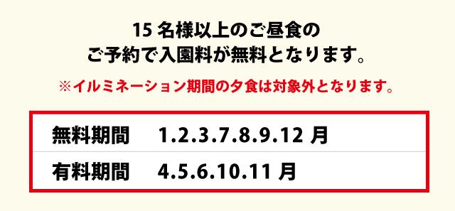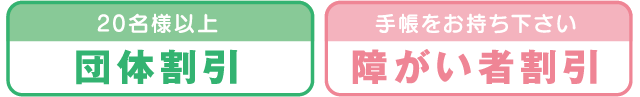 団体は20名様以上からとなり、当日の入園料より10%割引となります。入園料金は花の咲き具合により変動しますので、お電話にてご確認ください。また、障害者手帳をお持ちのお客様及び、介護施設団体様は当日の入園料より200円引きとなります。