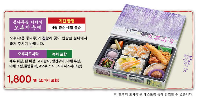 4월 중순~5월 중순에 개최되는 '등나무꽃 이야기' 기간 및 야간 영업 시의 저녁 식사는 예약하실 수 없습니다. 자세한 내용은 문의하여 주시기 바랍니다.
