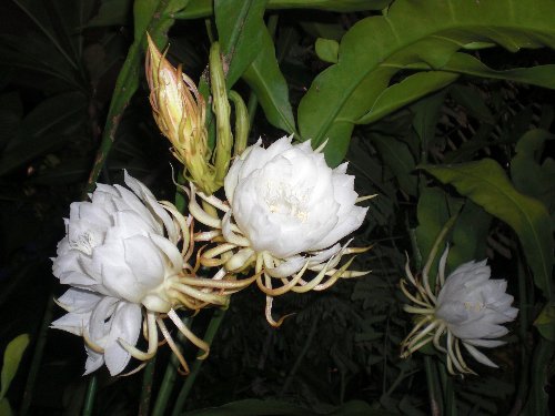 月下美人は夜に咲き始め翌朝までの一晩でしぼんでしまう為、なかなか見る事の出来ない花です。 昨晩、3つ同時に開花しましたので画像を掲載します。 まだ蕾がある物がありますので、タイミングが良ければ見る事ができるかもしれません。