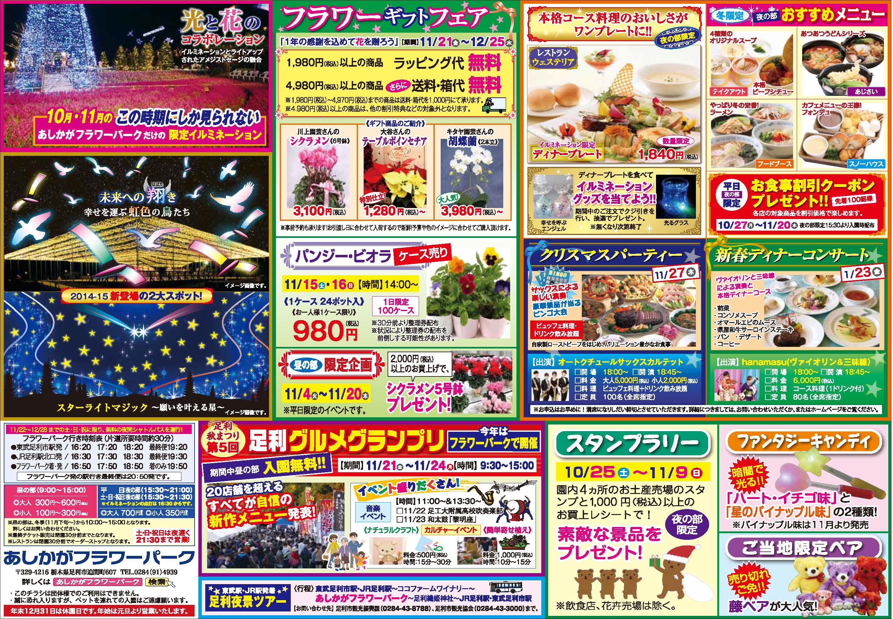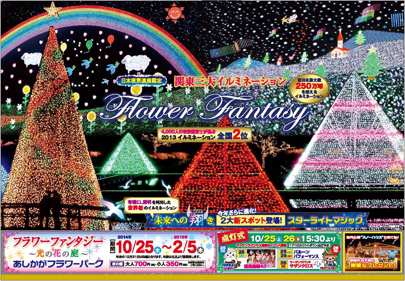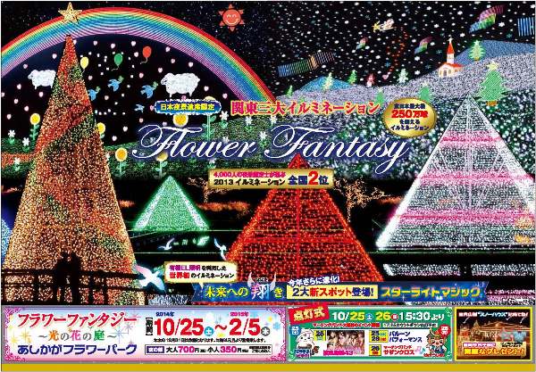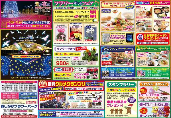 2014年10月25日(土)より フラワーファンタジー「光の花の庭」が開幕になります。 10月25日(土)、26(日)には点灯式も実施されます。 (点灯式の両日に関しては17:15頃の点灯となります) 詳細は下記のチラシをクリックして下さい(拡大されます)