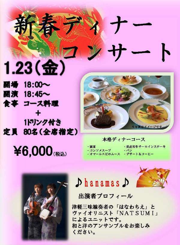 下記の日程において、あしかがフラワーパーク園内レストランにてイベントを開催します。前売りチケットが必要となります。お申し込みはお電話にてお願いします。 【日時】 1/23(金)18:00開場 【出演】 hanamas チラシをクリックで拡大されます。
