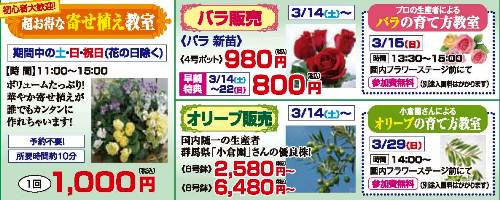 3/5(木)~4/12(日)の期間の「土・日・祝日」に限り お得な寄せ植え教室を実施いたします。 ※3/28(日)は花の日の為行いません。 その他、バラの育て方やオリーブの育て方の教室もございます。
