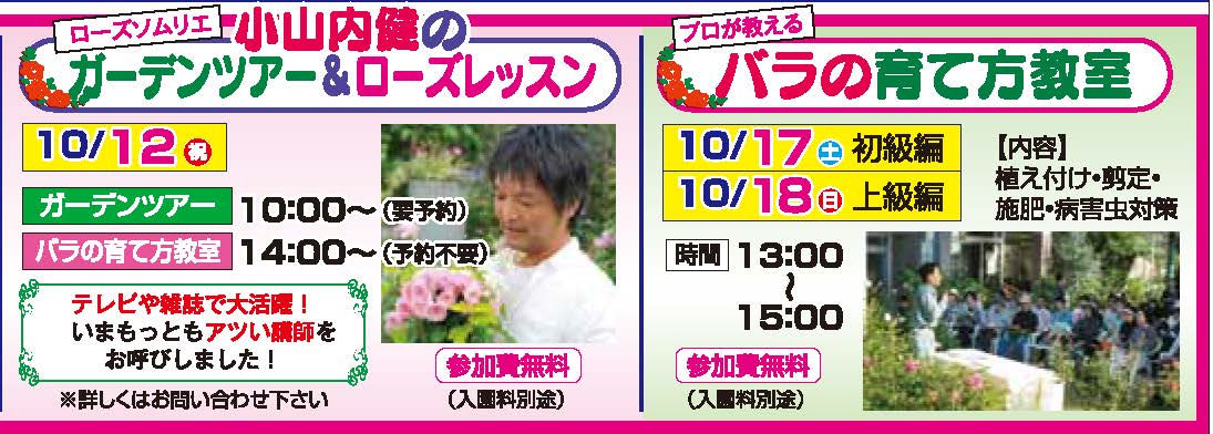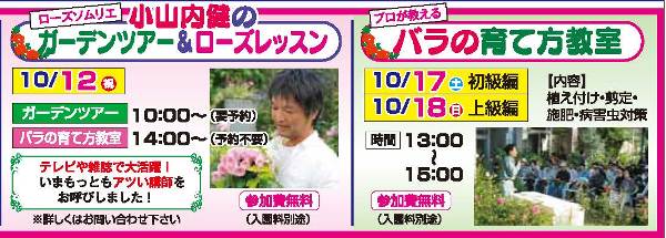 テレビや雑誌で大活躍の、今もっともアツい講師をお呼びしました! 1日限定での開催ですので、お早目にご予約下さい。 10/12(月) ガーデンツアー 10:00~(要予約) バラの育て方教室 14:00~(予約不要) また、当園のバラ担当者が講師をする人気の教室も開催!! 参加費無料の教室ですので、お気軽にご参加ください。 10/17(土)初級編 13:00~15:00 10/18(日)上級編 13:00~15:00 (画像クリックで拡大します)