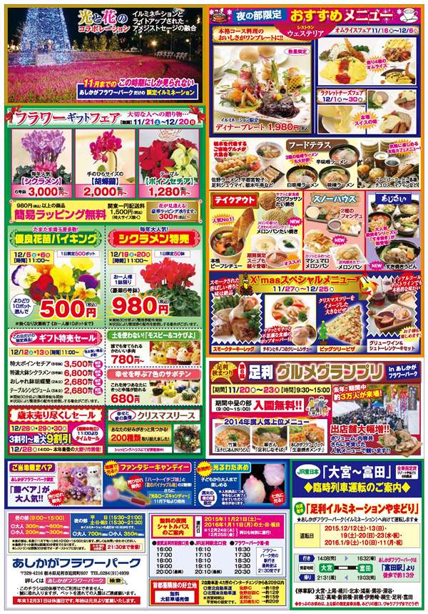 群馬県(前橋、伊勢崎、高崎など)埼玉県(川口、浦和、熊谷など)に 新聞折込チラシが入ります。 足利秋まつりの情報や、セール情報など是非ご覧ください。 11/19(木)まで昼の部・夜の部の入替はございません。 詳細は下記のチラシをクリックして下さい(拡大されます)