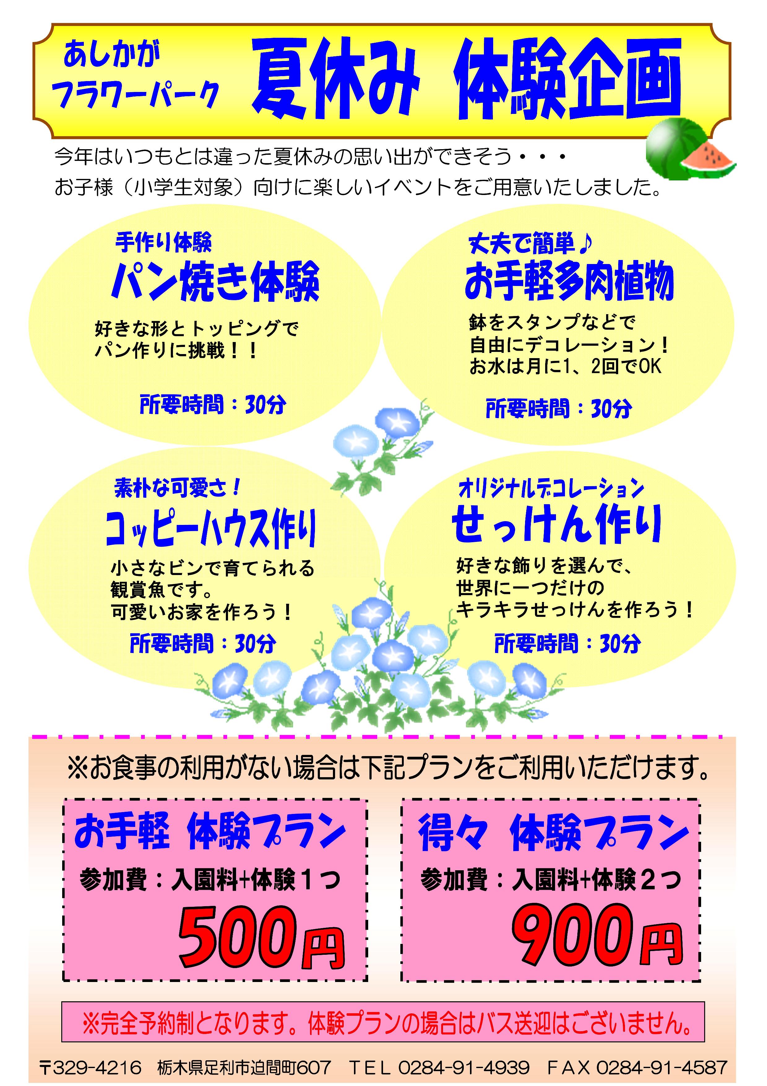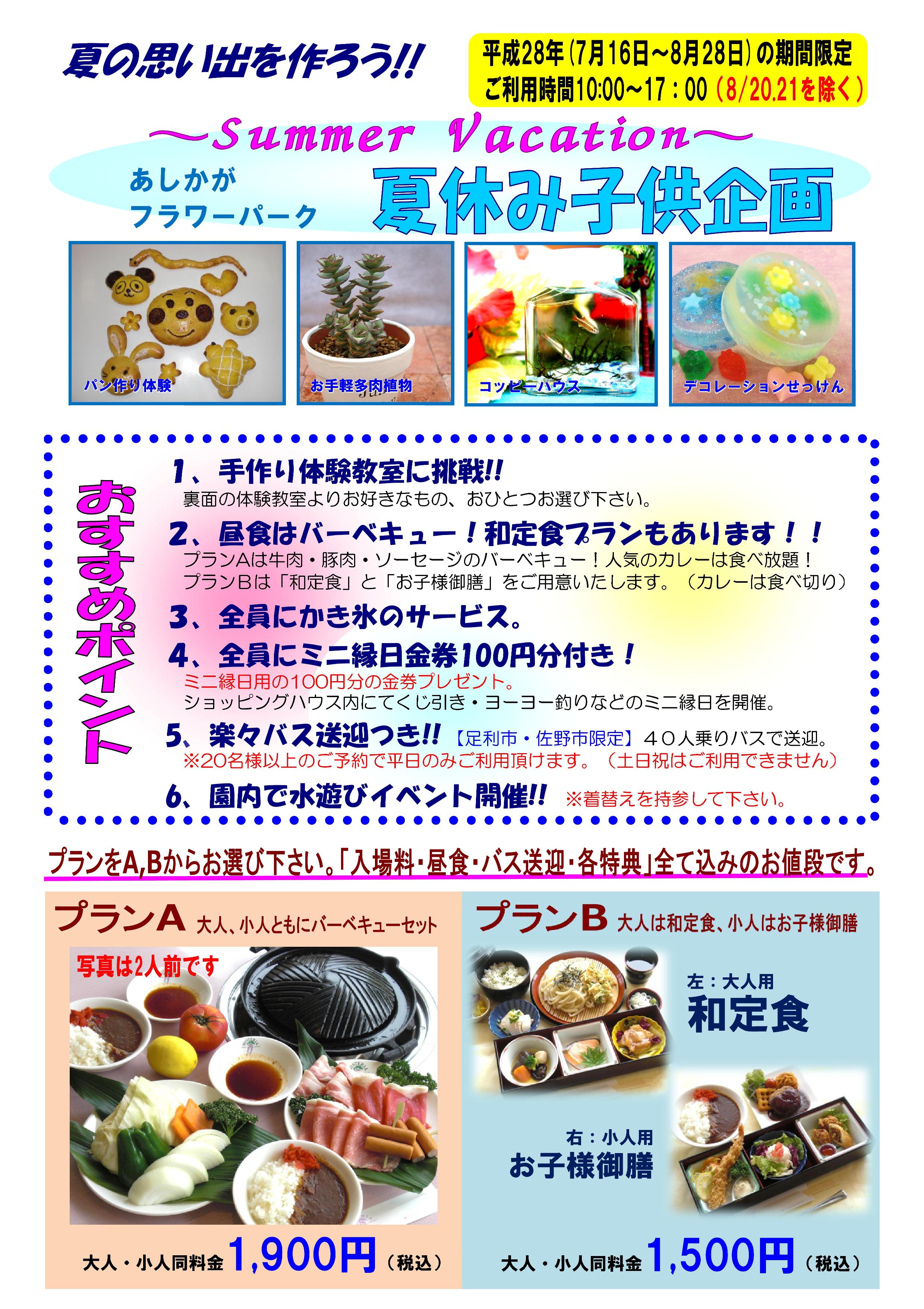 毎年人気の育成会・子供会企画です。ご予約は15名様以上となります。 バスの送迎は20名様以上にて「足利市、佐野市」のみとなりますのでご了承ください。 ※当日は園内にて水遊びができますので、着替えを持参して下さい。 ※画像クリックで拡大します。