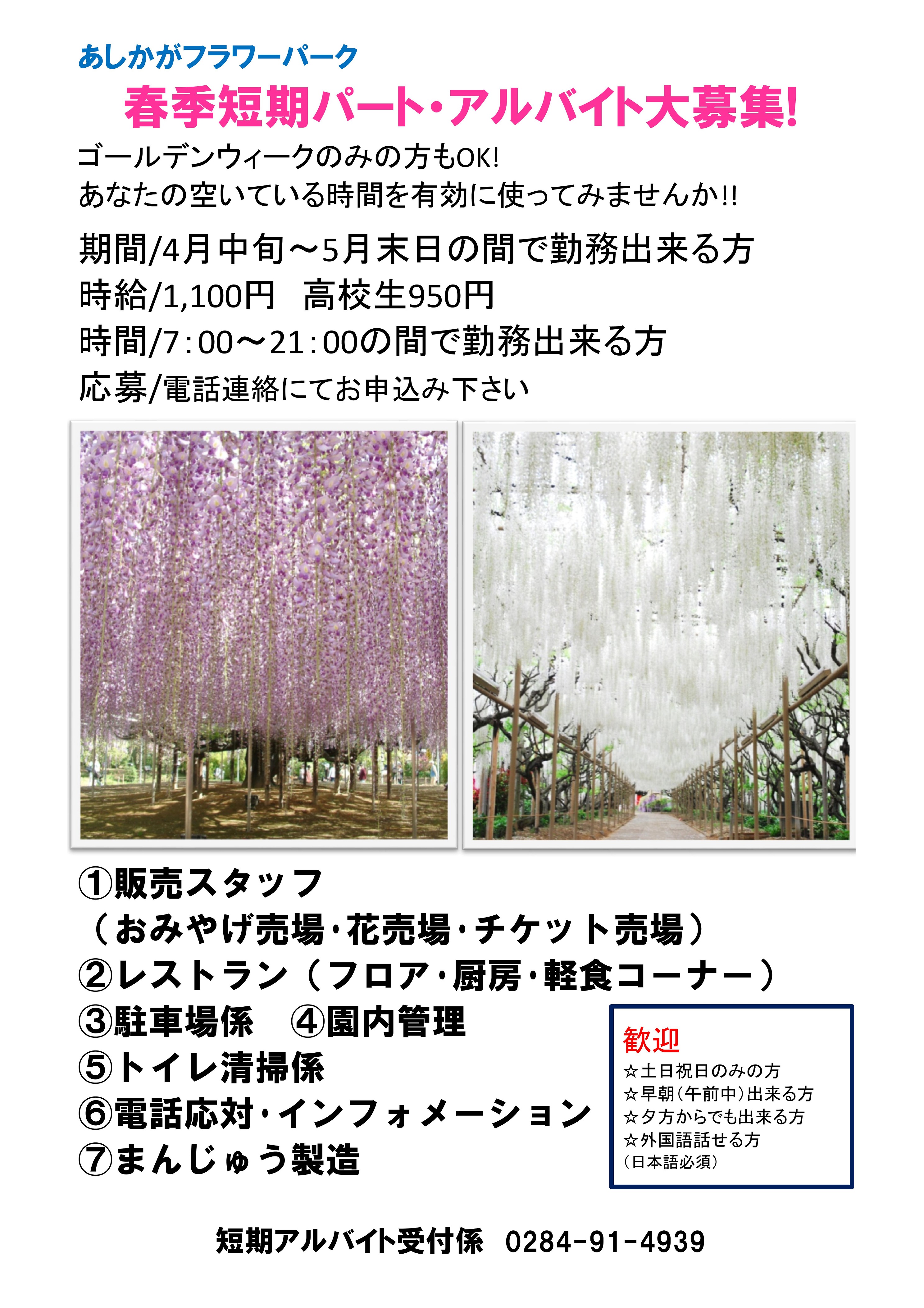 短期アルバイト総勢300名大募集!! 常勤(長期アルバイト・長期パート)正規雇用制度もございます。 是非お問い合わせ下さいませ。 短期アルバイト受付係 0284-91-4939 詳しくは下記をご覧ください。 (クリックで拡大します)
