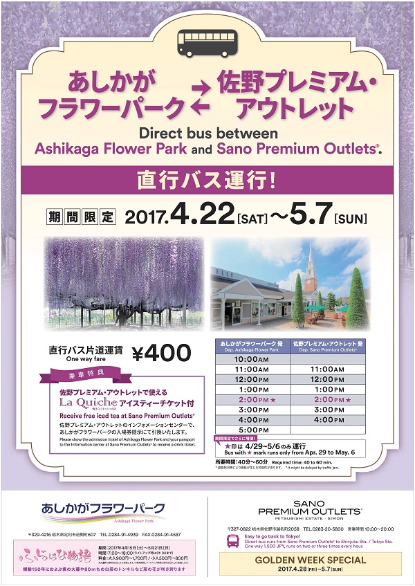 「あしかがフラワーパーク」と「佐野プレミアム・アウトレット」を結ぶ直行バスを運行!