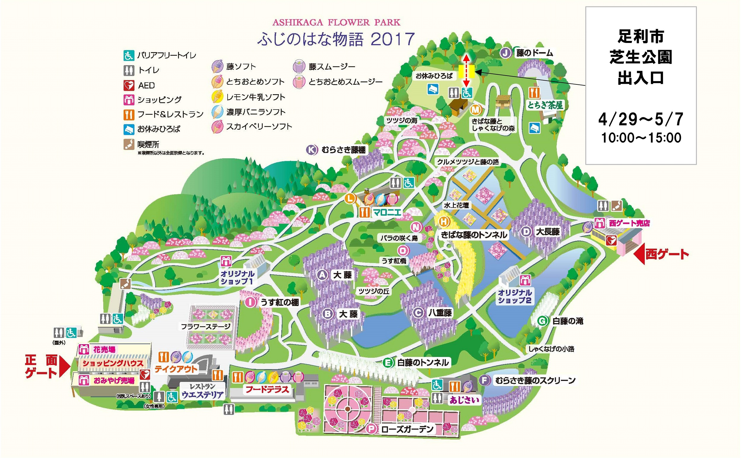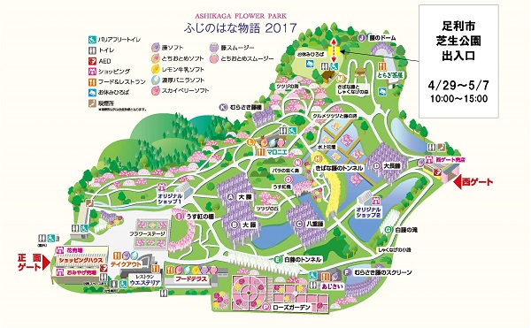 園内の混雑緩和の為、期間限定にて足利市の芝生公園ゲートを開放いたします。 尚、出入りの際は入園券が必要となります。 利用可能日時:4/29(土)~5/7(日) 10:00~15:00
