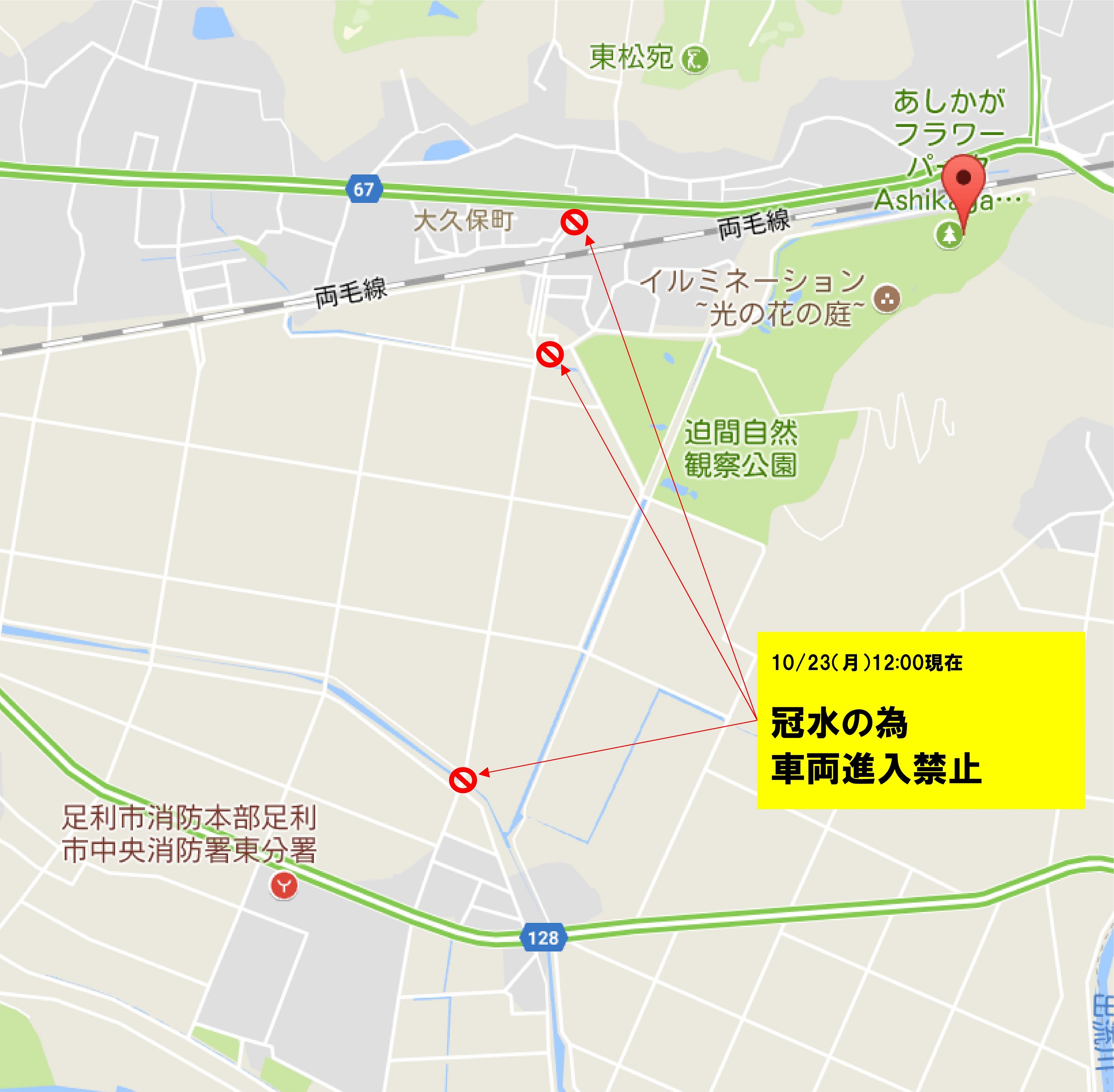 台風の影響により、周辺道路の一部が冠水しております。 現在は進入路が通行止めとなっております。(14:45現在) 本日(10/23)夜の部イルミネーションは休園とさせて頂きます。 周辺道路の通行止めの状況や、園内の状況を考慮し判断させて頂きました。 誠に申し訳ございませんがご理解、ご了承くださいませ。 詳しくはお電話下さい。 あしかがフラワーパーク 0284-91-4939 通行止め箇所