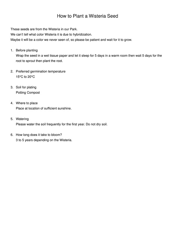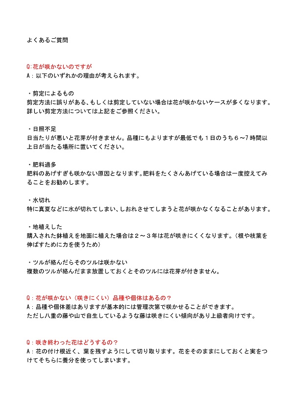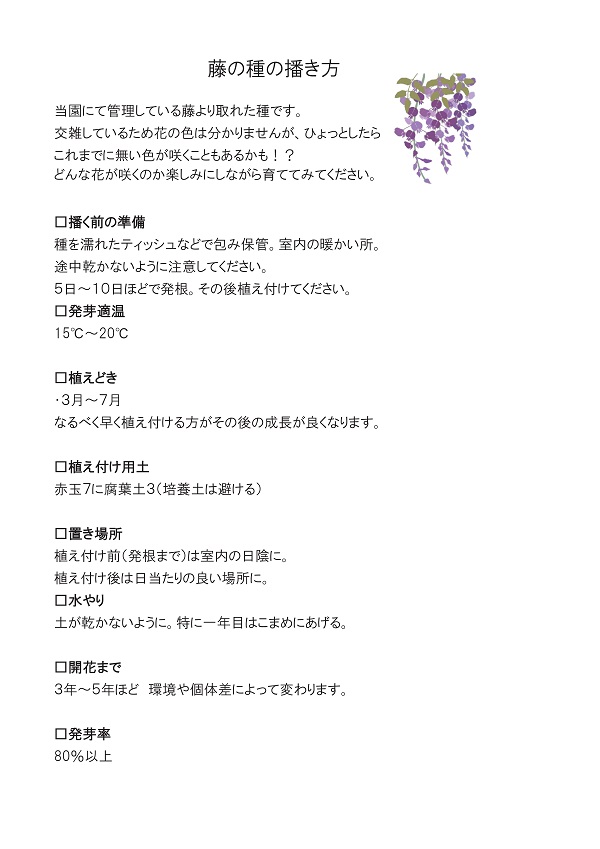 藤の育て方(日本語) 詳細は画像をクリックしてください。 藤の育て方(English) 詳細は画像をクリックしてください。 藤の種のまきかた(日本語) 詳細は画像をクリックしてください。 藤の種のまきかた(English) 詳細は画像をクリックしてください。 よくあるご質問 詳細は画像をクリックしてください。