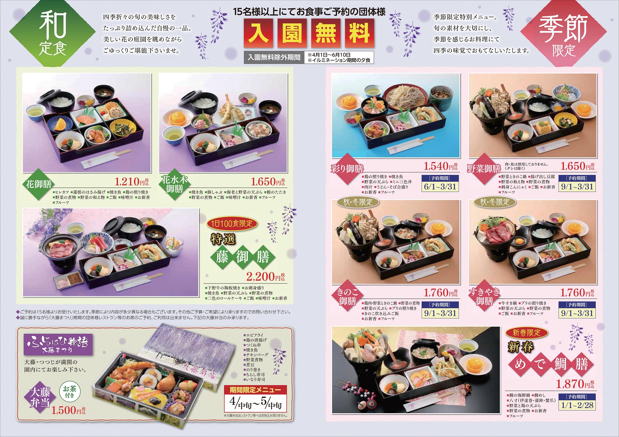 2019年10月1日より団体様食事メニューが改定となります。 旧メニューは2019年9月30日までの利用に限ります。 10月1日以降につきましては下記の新メニューよりご予約をお願いします。 (画像をクリックで拡大します) 食事メニューのPDFファイルは → こちら