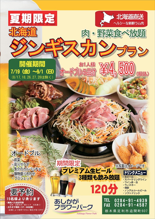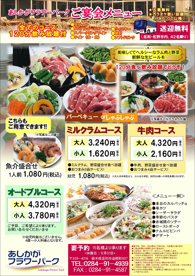 夏季限定のお得な宴会プラン(15名様以上の事前ご予約制)がございます。 詳しくはお問い合わせください。 ℡0284-91-4939 (画像クリックで拡大します) 通常の宴会プランは下記よりご確認ください。 (画像クリックで拡大します)