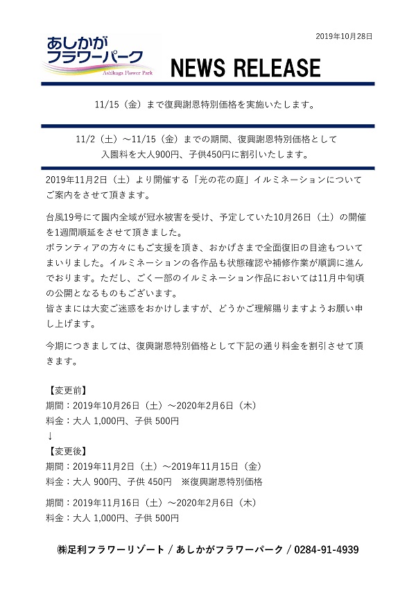 2019年10月28日(月)【重要なご案内】11/2~11/15の期間イルミネーション復興謝恩特別価格を実施いたします。