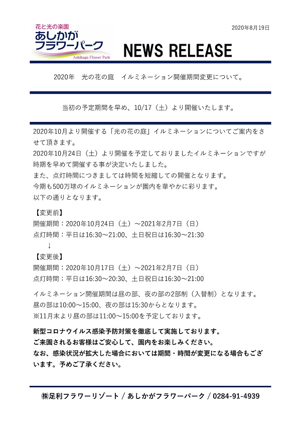 2020年08月19日(水)【光の花の庭】イルミネーション10/17(土)より開催について
