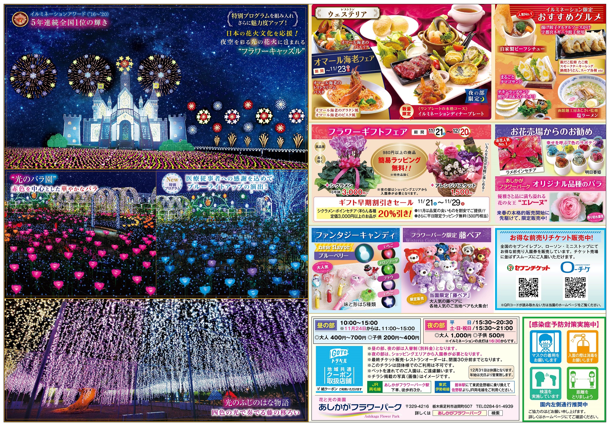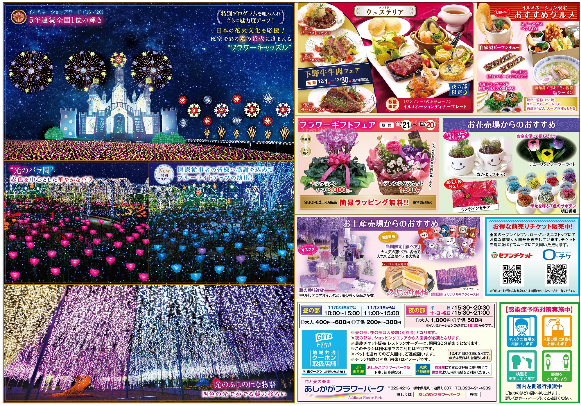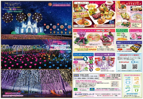 500万球のイルミネーション「光の花の庭」 折込チラシ 以下の通りチラシ掲載内容に変更がございます。 【変更前】 夜の部 15:30~20:30(土日祝日は21:00まで) 【変更後】 夜の部 15:30~20:00 ※平日、土日祝日問わず20:00までの営業時間となります。 ※チケットの販売は19:30までとなります。 ※各画像はクリックすると拡大表示できます。 折込チラシ(第五弾) 折込チラシ(第四弾) 折込チラシ(第三弾) 折込チラシ(第二弾) 折込チラシ(第一弾)