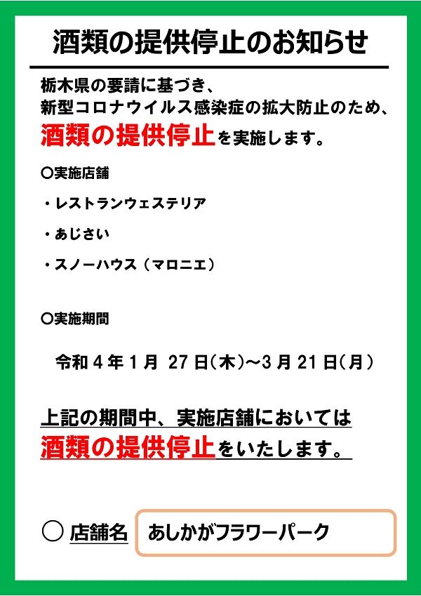 栃木県の要請に基づき、新型コロナウイルス感染症の拡大防止のため、 以下の店舗において、酒類の提供停止を実施いたします。 実施店舗 ・レストランウェステリア ・あじさい ・スノーハウス(マロニエ) ※3/21(月)まで期間が延長となりました。
