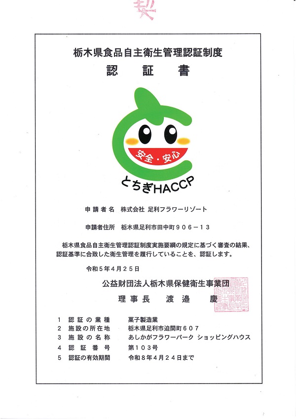 栃木県食品自主衛生管理認証制度(とちぎHACCP)は、食品の安全性を確保するため、衛生管理の国際標準であるHACCPによる手法を取り入れて基本的な衛生管理を確実に続けることができる施設を認証する制度です。 この度、当園の菓子製造業において認証を頂きました。