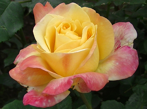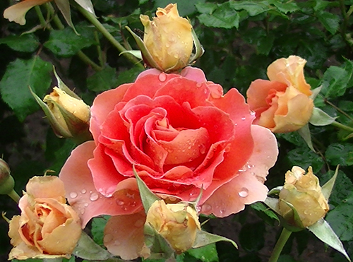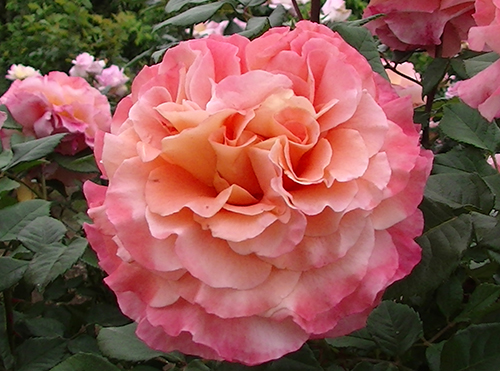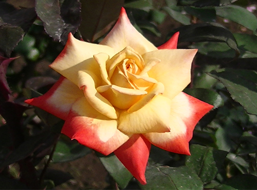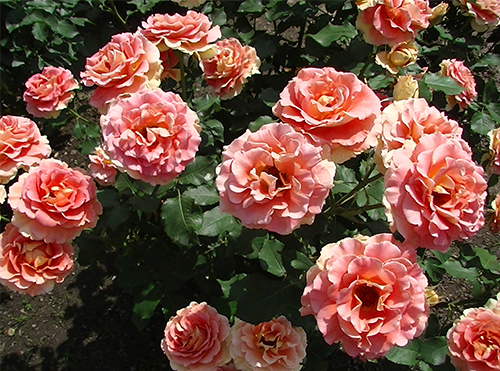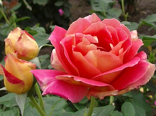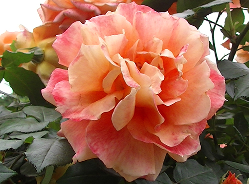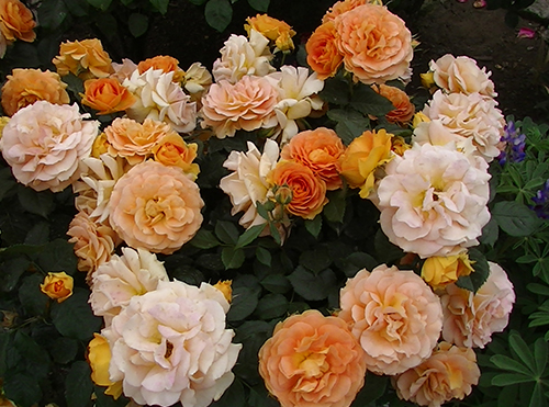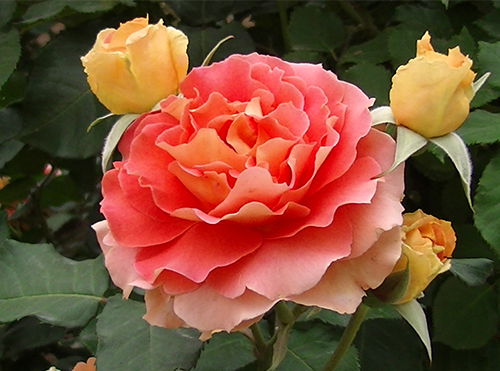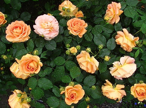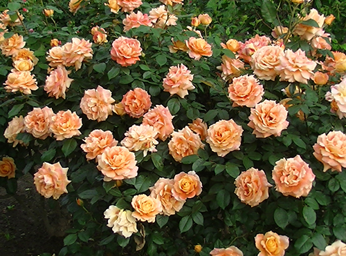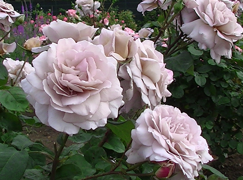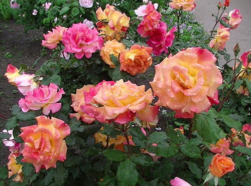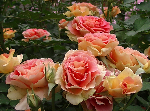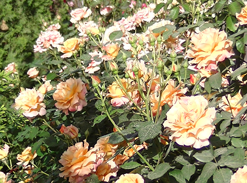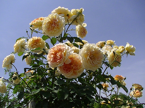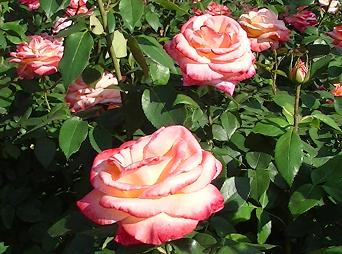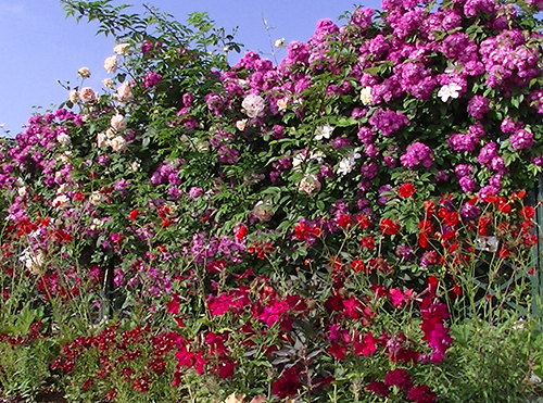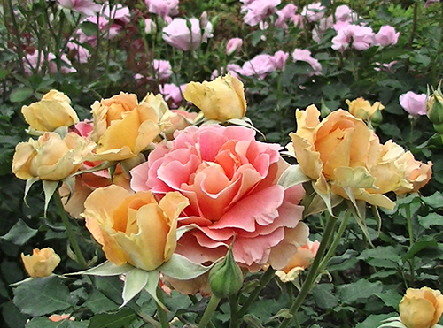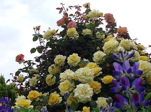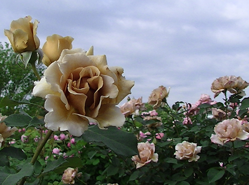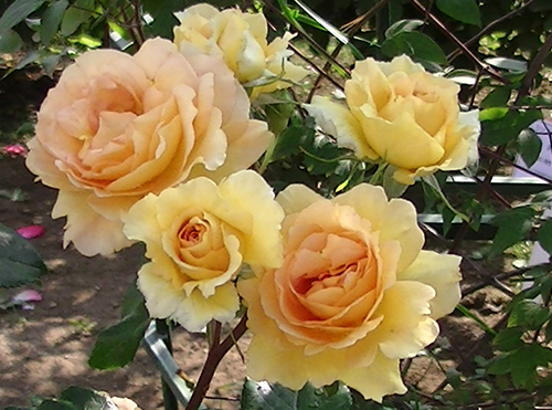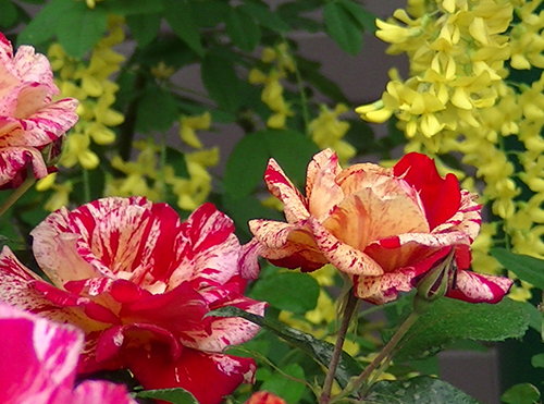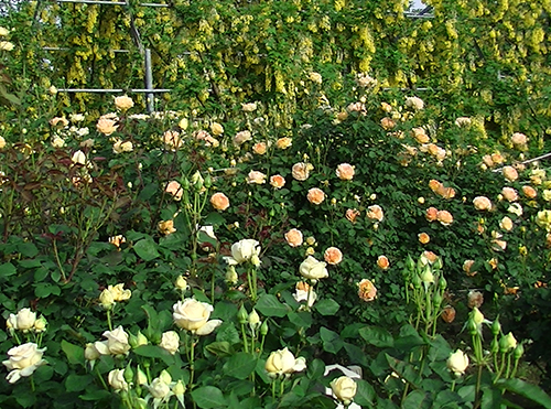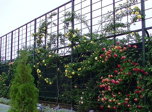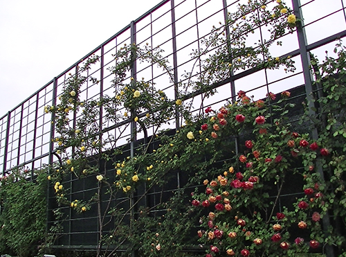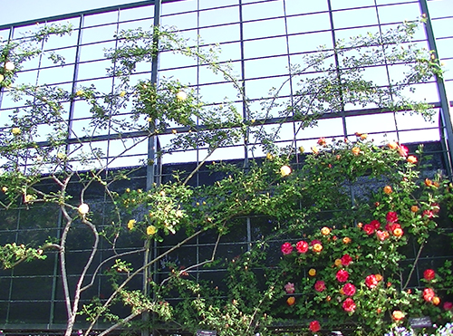 カクテルツルバラやスパニッシュ・ビューティーがフラワーステージ脇で見頃となっております!
