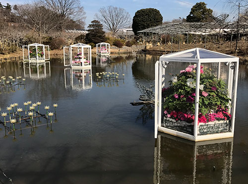 水上に浮かぶ冬咲きボタン