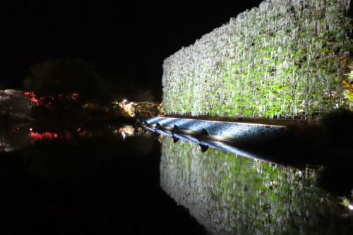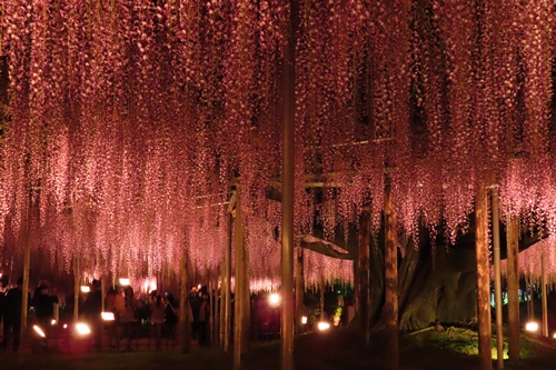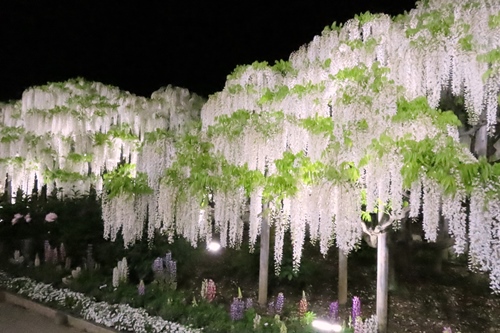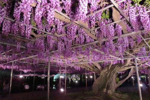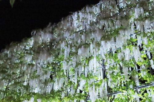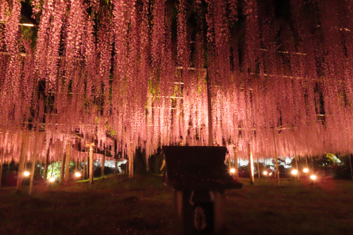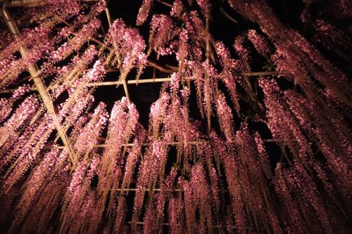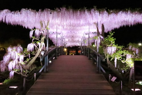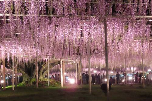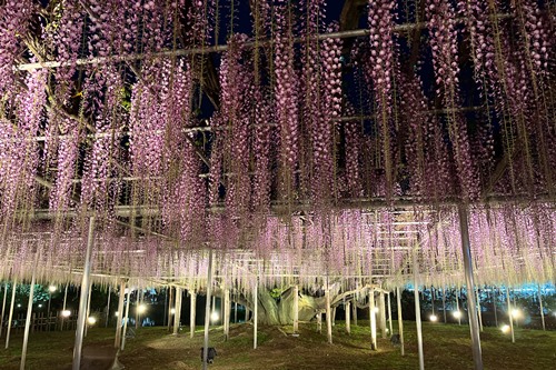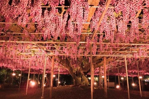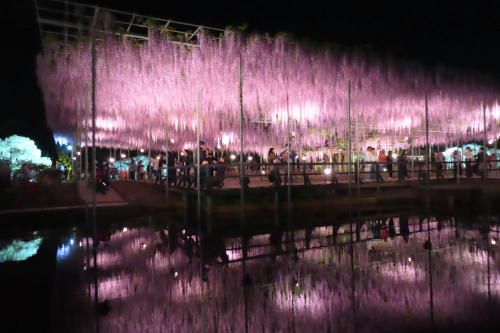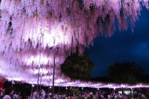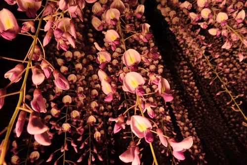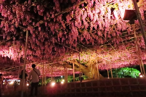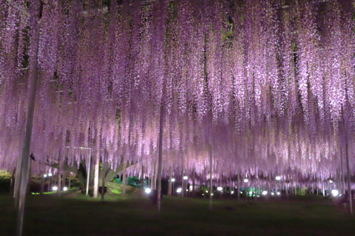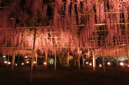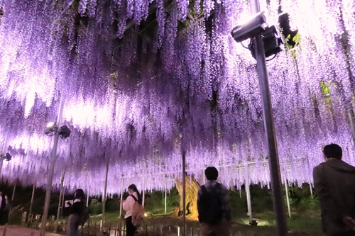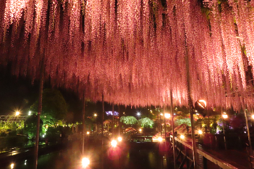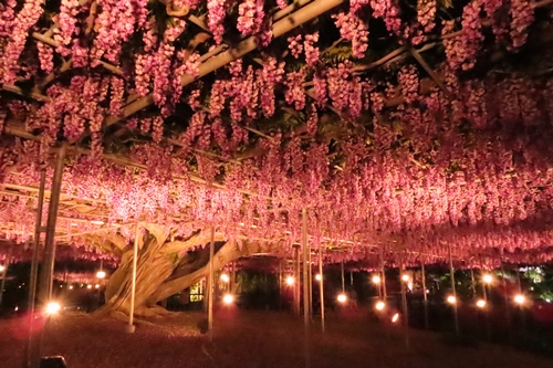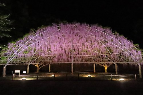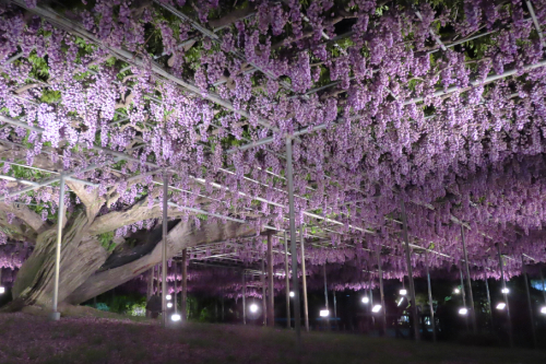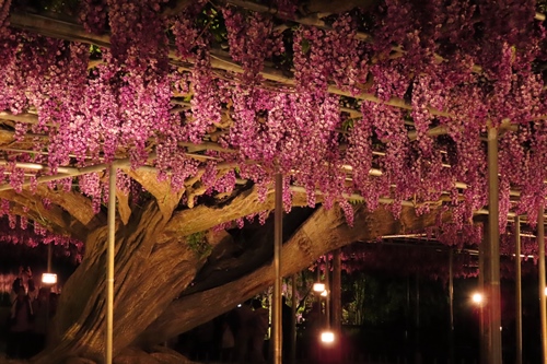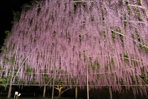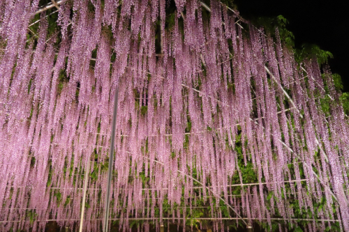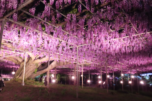 昼間とは全く景色が変わる、ライトアップされた幻想的な藤。