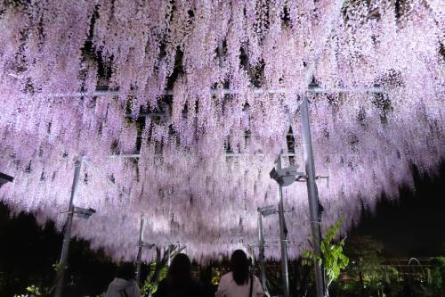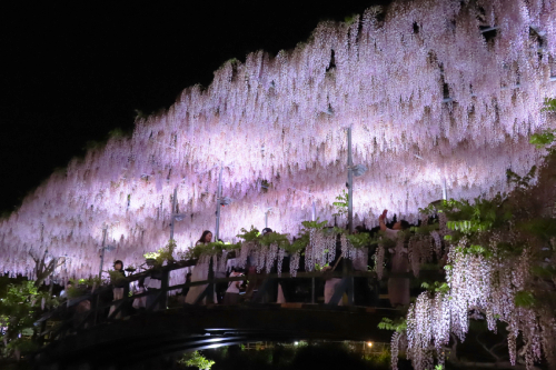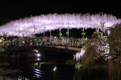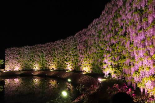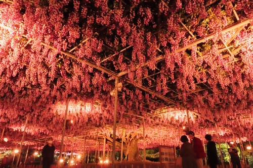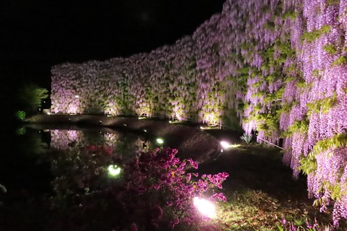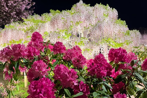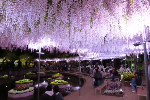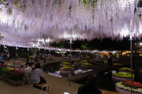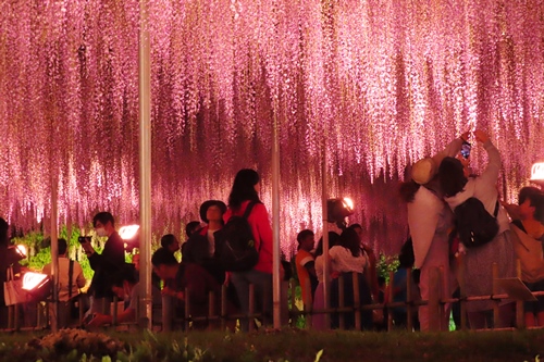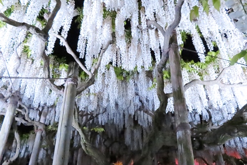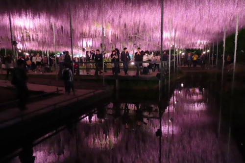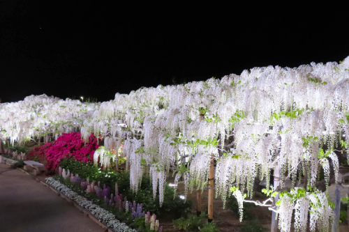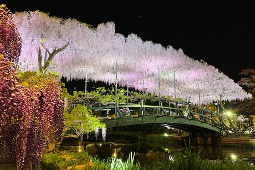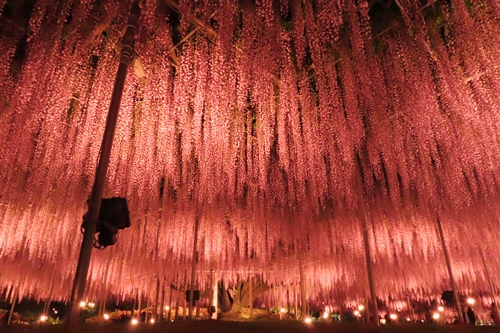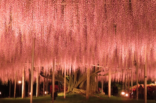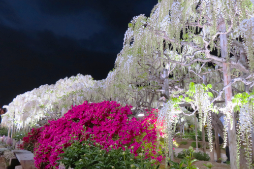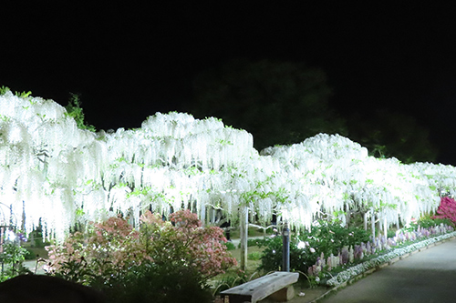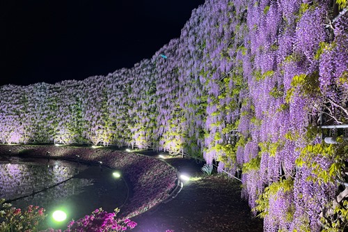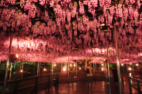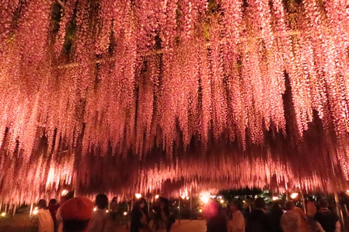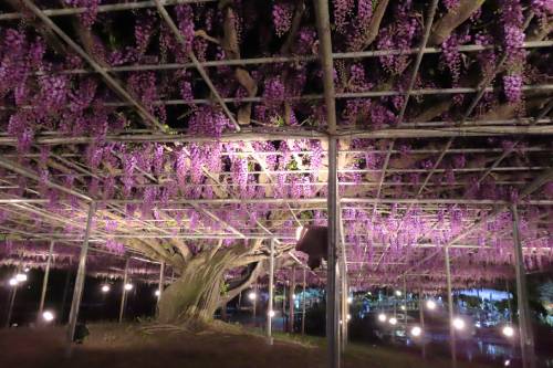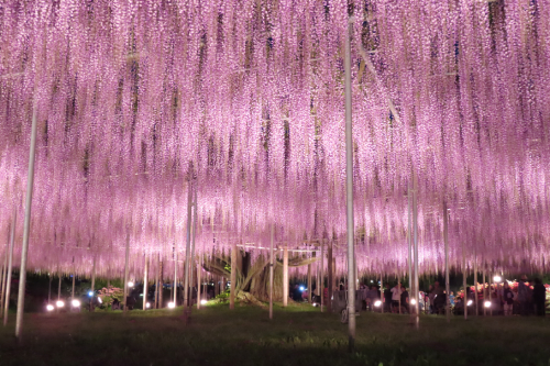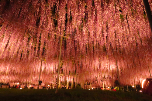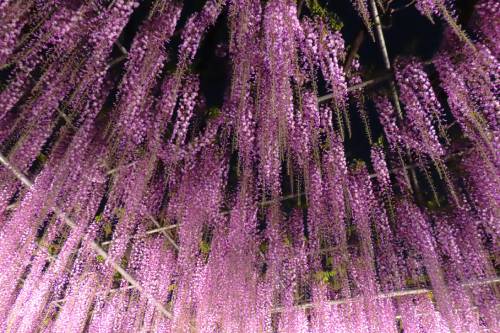 昼間とは全く景色が変わる、ライトアップされた幻想的な藤。