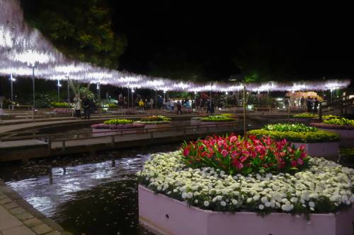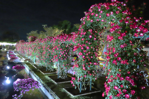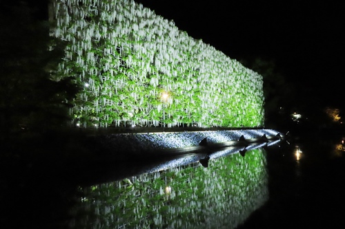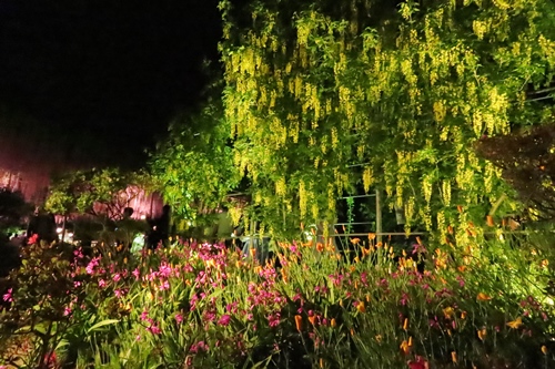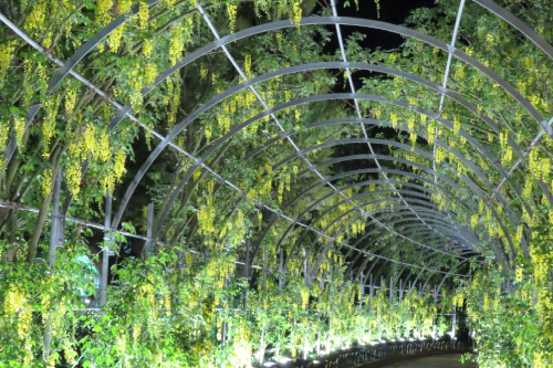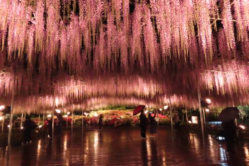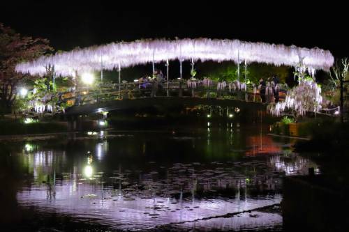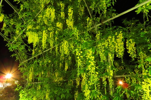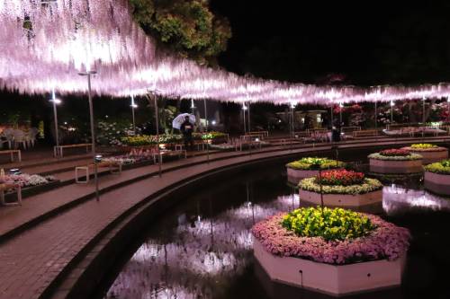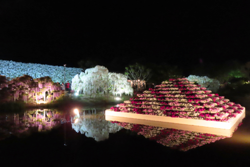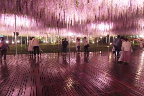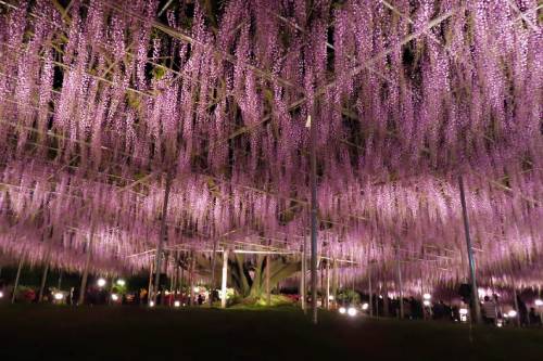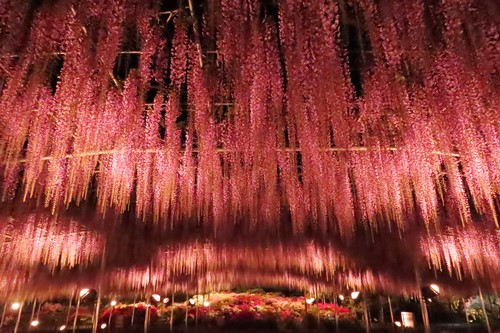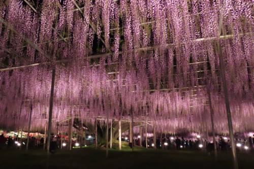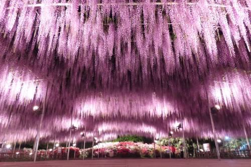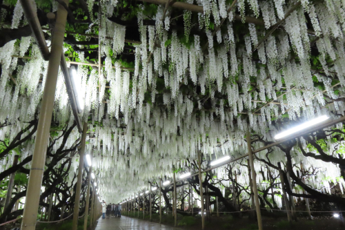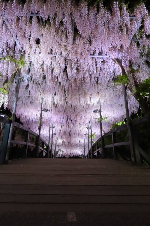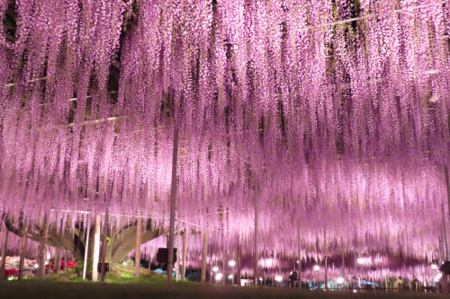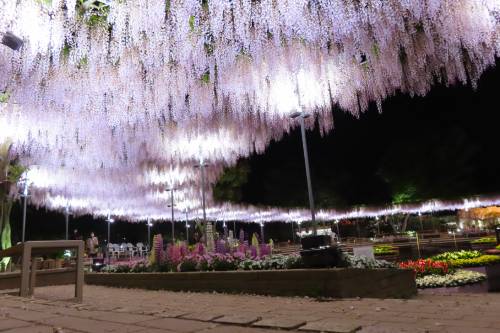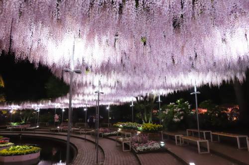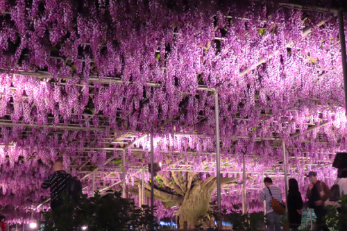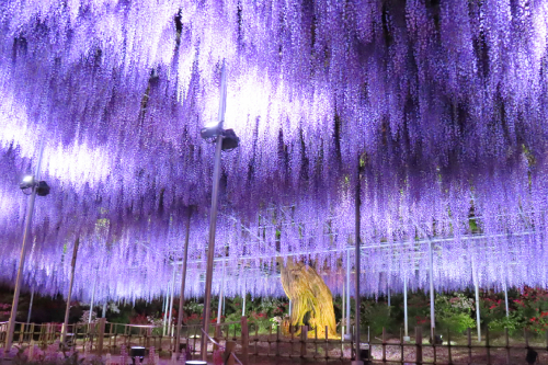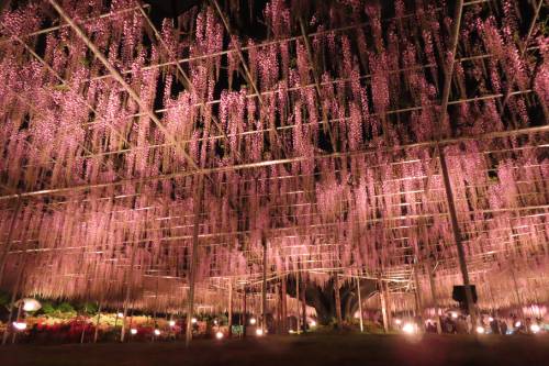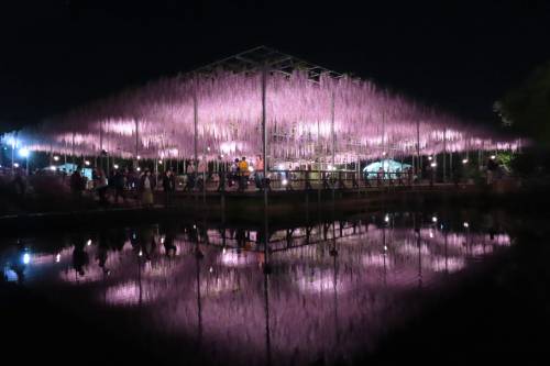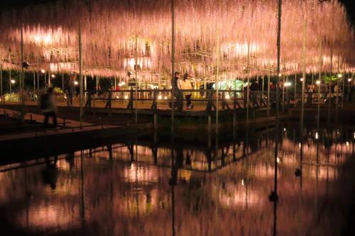 昼間とは全く景色が変わる、ライトアップされた幻想的な藤。
