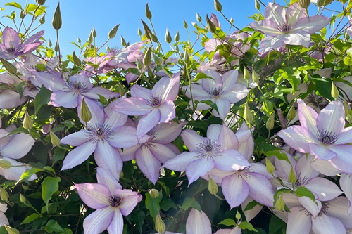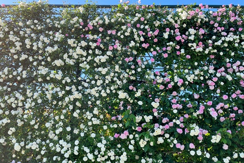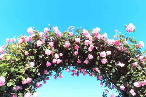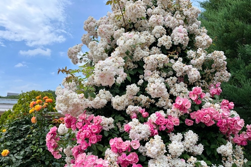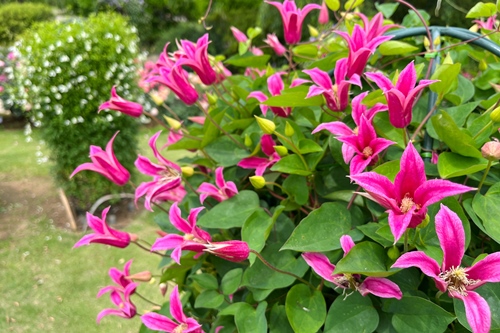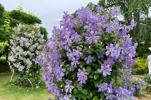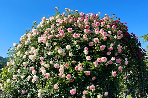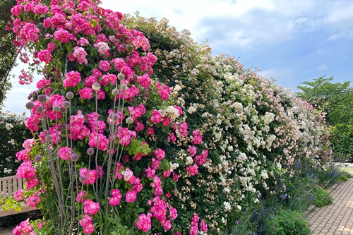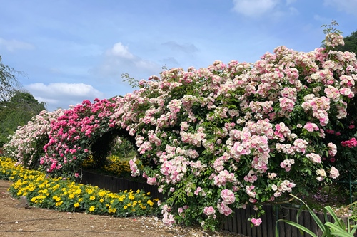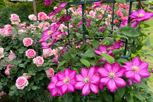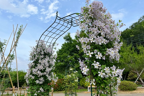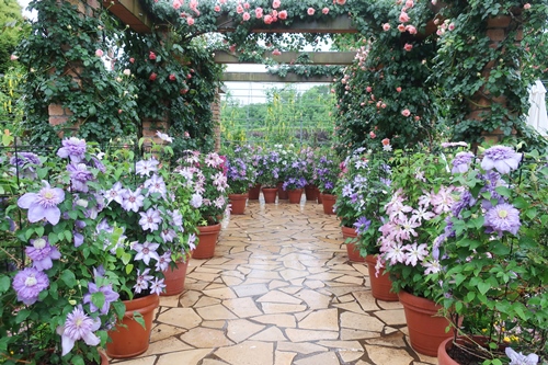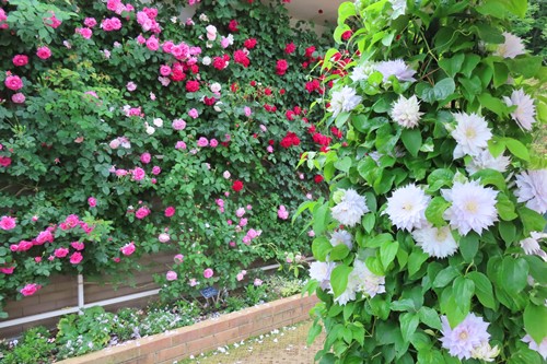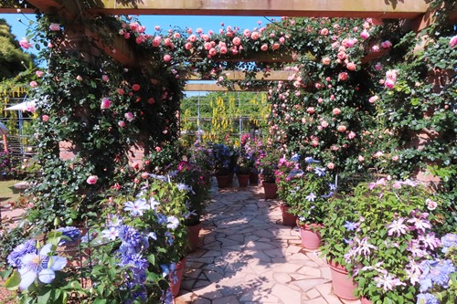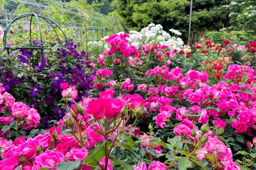 見頃が続くバラ、クレマチスが織りなすカラフルな世界。