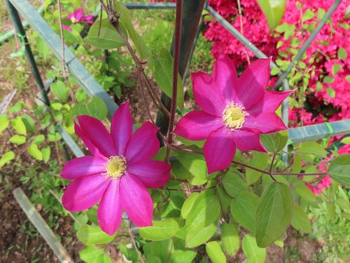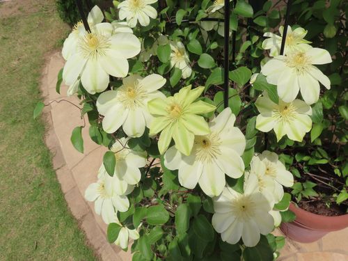 遅咲きのクレマチスはまだまだ伸びているので誘引作業が欠かせません。