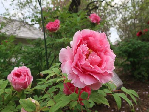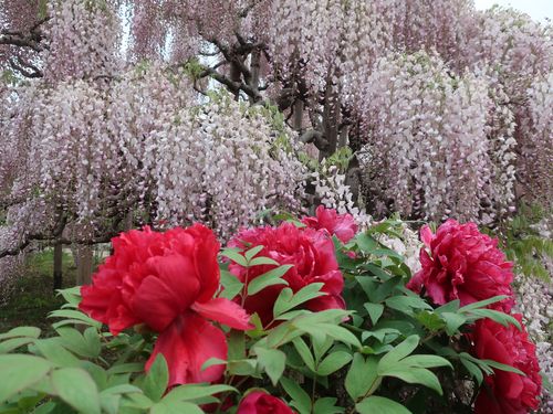 ↓庭木仕立てのうす紅藤と牡丹のツーショット。牡丹も園内各所で見頃を迎えています。