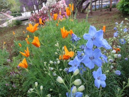 ↓オレンジ色のハナビシソウと、鮮やかなブルーのデルフィニウム。ハナビシソウは、こぼれ種で育った株と植栽した株の二通りありますが、どちらも綺麗に咲いています。