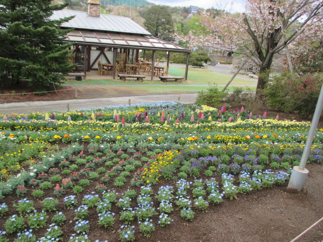 ただいま園内の見ごろの花はチューリップ、ビオラ、黒船つつじ、シャクナゲたちです。