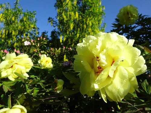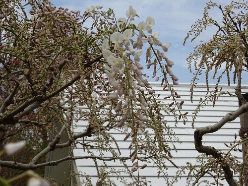 藤の引き立て役、クレマチスやボタンも咲き出してきました。今年は藤以外の花も開花が早いですよ!