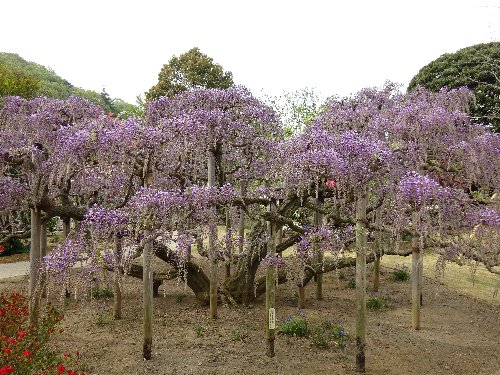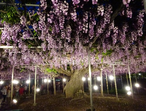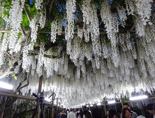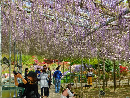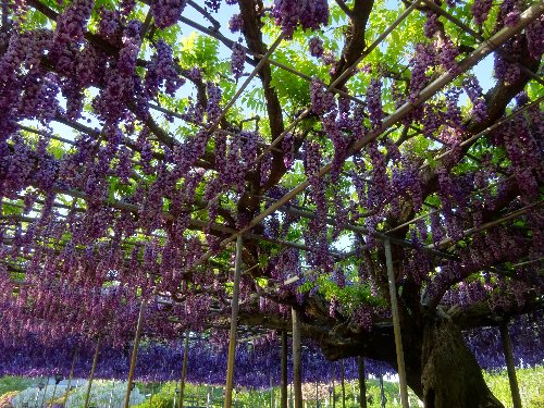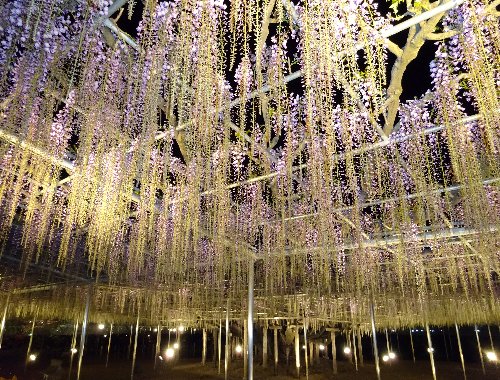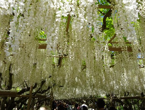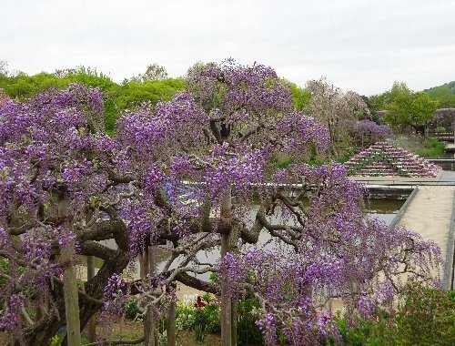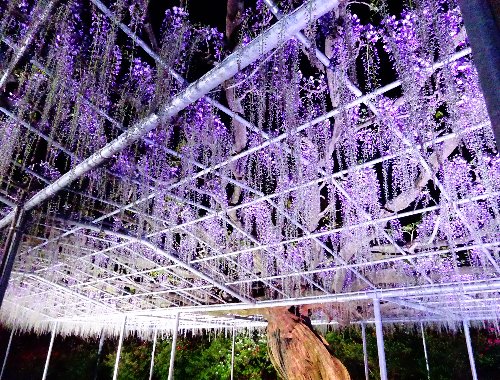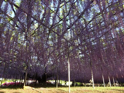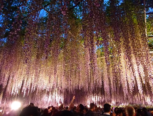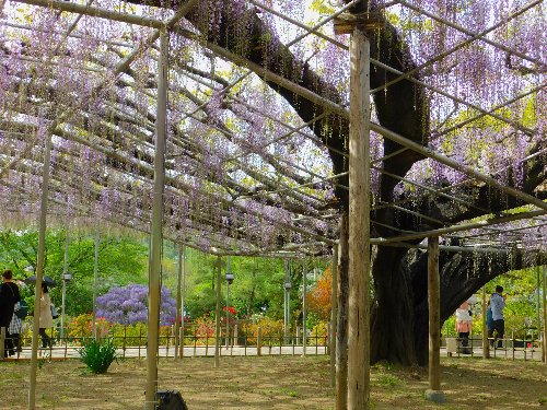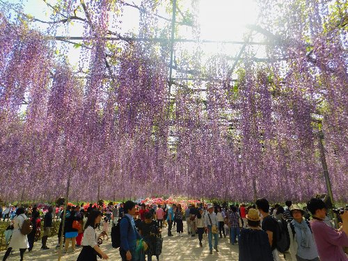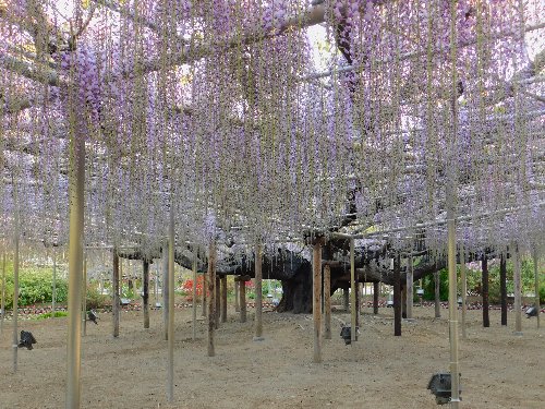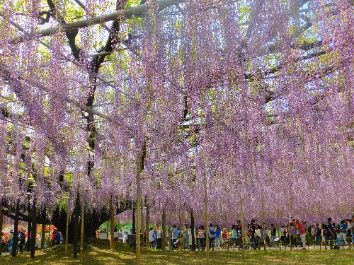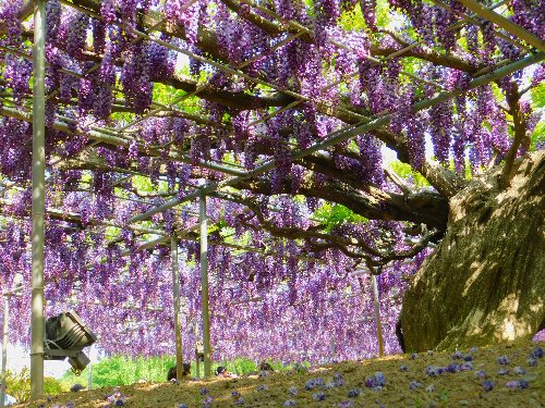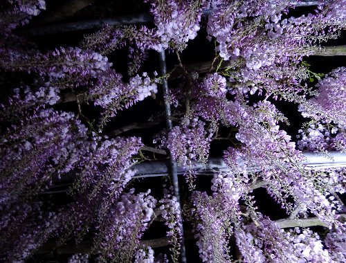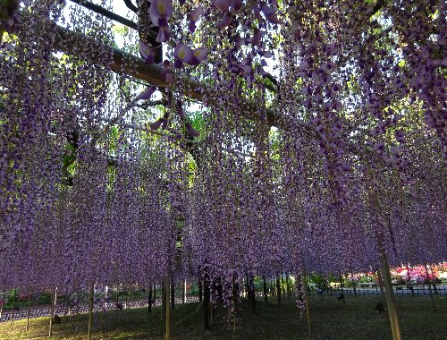 大藤、満開を迎えています。2枚の藤棚が連なった1,200畳敷きの紫色の世界は、どこまでも続いているように見えます。