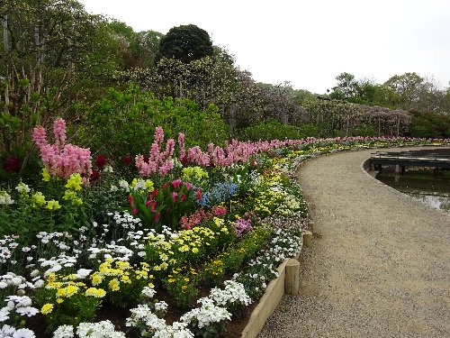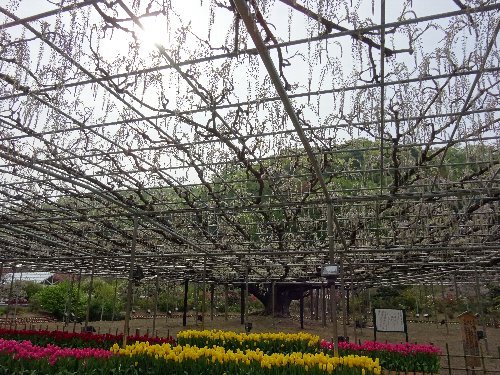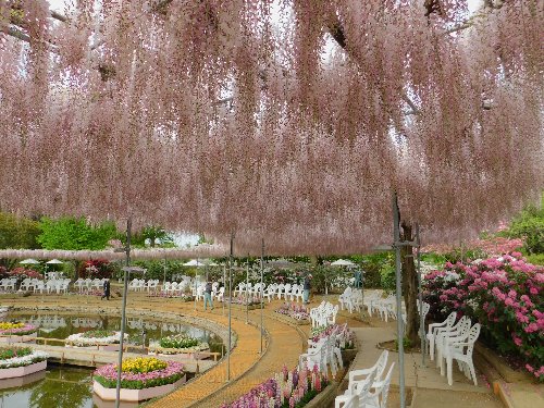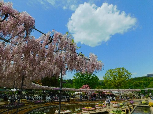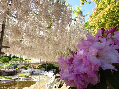 いつもなら大型連休に見頃を迎える藤ですが…暖かな日が続いた今年は今!一番綺麗な時を迎えています!!大藤・白藤・さくら色の藤(うすべに藤)をはじめ、各種花々が咲き乱れる園内は百花繚乱。藤の香りに満たされたまさに花の楽園です。