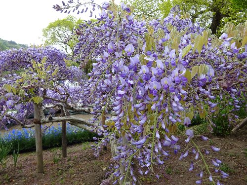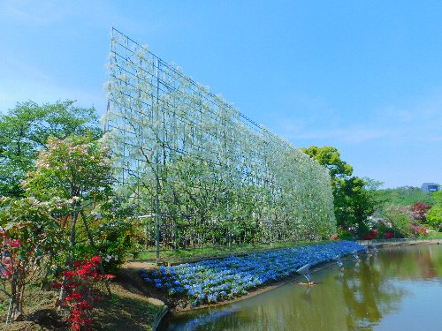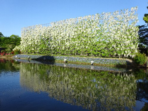 白藤の滝は、水鏡効果で高さが倍に見えます!白藤の下のネモフィラと合わさり、美しい花の滝があらわれました。