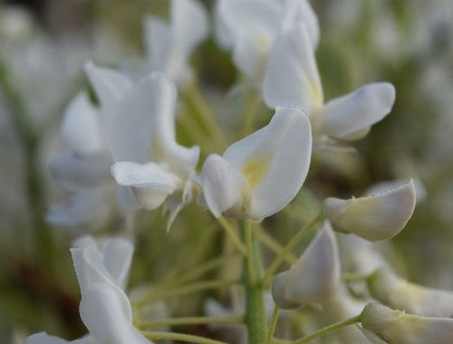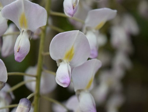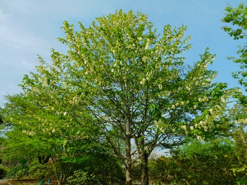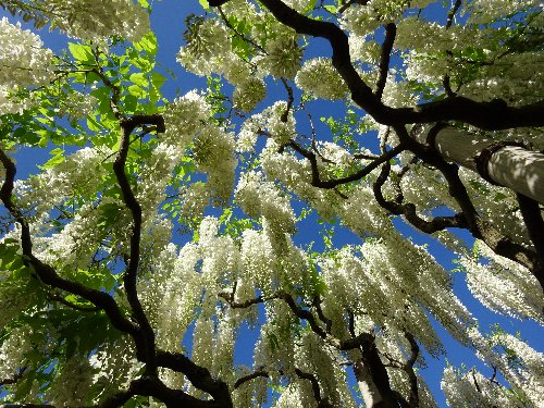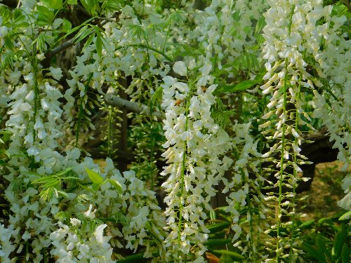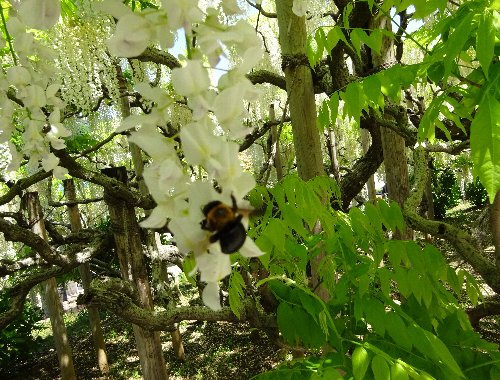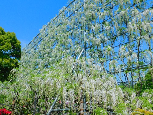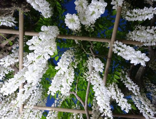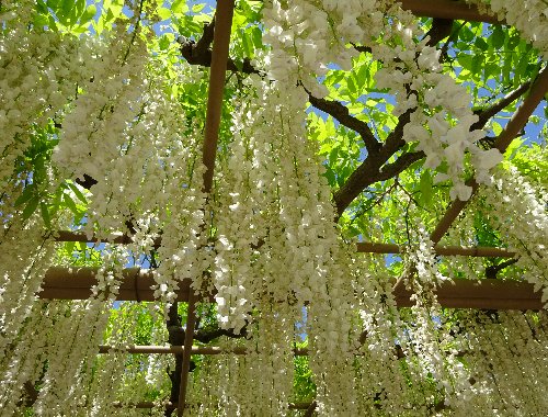 白藤も満開を迎えました。庭木仕立ての藤の中から見上げてみると、青空を覆い尽くさんばかりの花のシャワーを浴びることが出来ます!