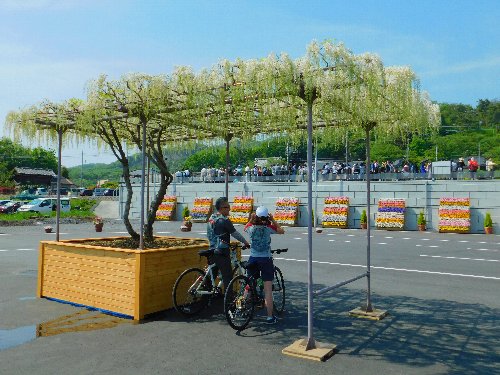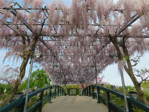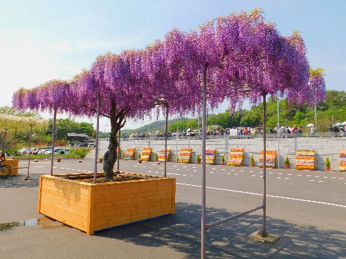 紫と白の大きな藤がお出迎えです!園内に入る前から気分を高めてくれます!