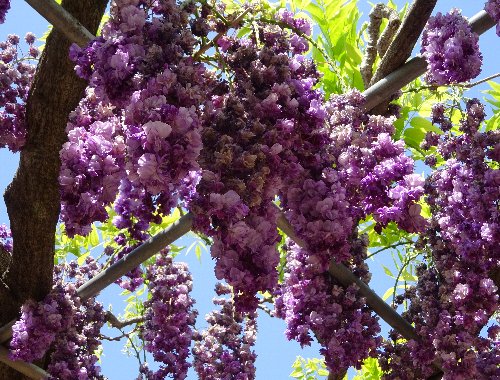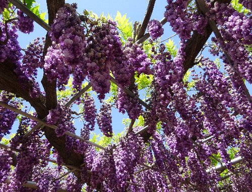 見頃を迎えた大藤。太陽の光を浴びてキラキラと輝いています。