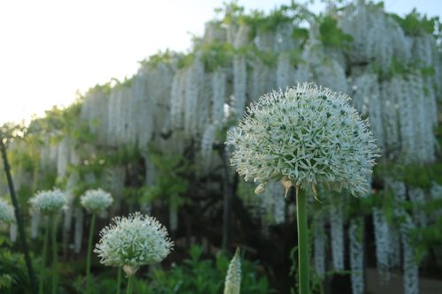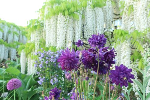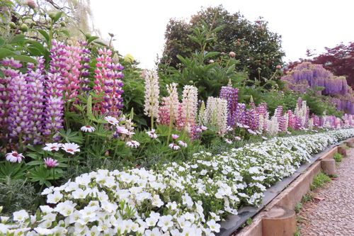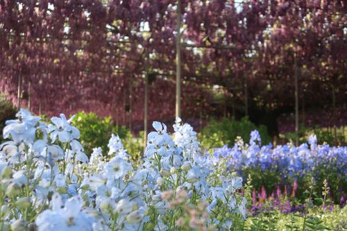 ローズガーデン側であれば、花壇の様々な花達と一緒に白藤を楽しめます。