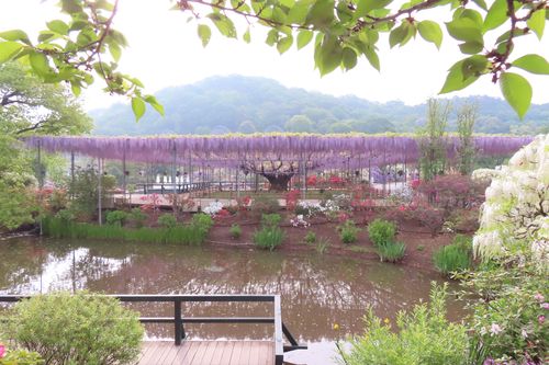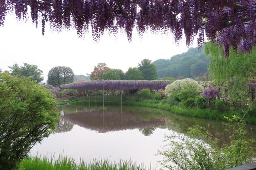 八重藤の棚から見る大藤です。木製の手すりに寄りかかりながらきれいな水鏡を眺められます!!